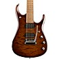 The Music Man JP15 roasted quilt maple top 7-string electric guitar is the first John Petrucci production model to feature a roasted maple fretboard and roasted maple top. The okoume body features a Sahara Burst satin finish and a pair of DiMarzio Illuminator humbuckers. The roasted, figured maple neck is finished in gunstock oil and wax. Piezo, 20dB gain boost and custom pearl JP15 inlays come stock on every JP15.